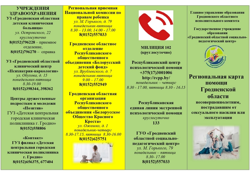 09.00 - 19.00 (80152) 55 88 06 УЗ «Гродненский областной клинический центр «Психиатрия-наркология»» г. Гродно ул. Обухова, 15 08.00 – 20.00 (80152)75-54-13 Центр дружественный подросткам «Контакт»
