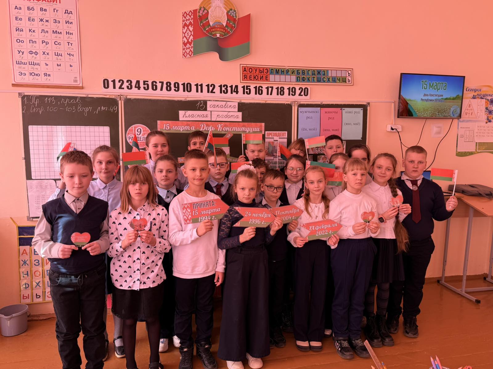 13 марта в 4 «Б» классе прошел единый урок , приуроченный ко Дню Конституции Республики Беларусь. Этот праздник является важной датой для каждого гражданина нашей страны, и наши юные ученики уже с начальной школы знакомятся с основными законами и символами государства.